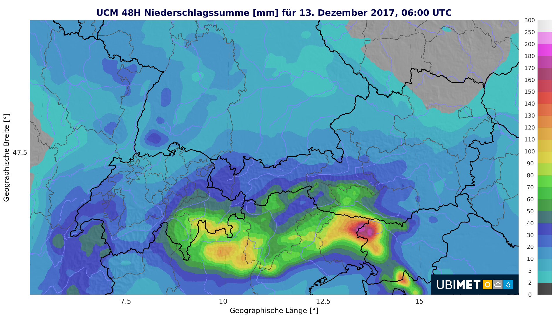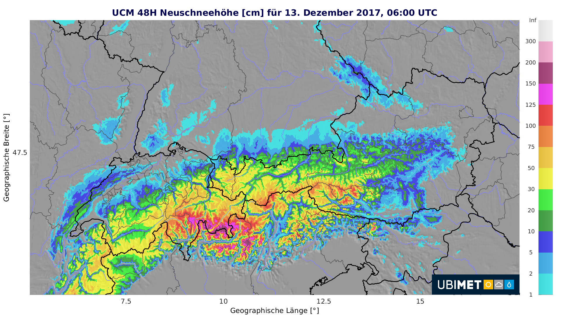 Wien, 11.12.2017 – Das turbulente Wetter in weiten Teilen Europas geht in der dritten Adventwoche laut UBIMET weiter. Schon am Sonntag hat das Tief „Xanthos“ in großen Teilen Deutschlands, Großbritanniens und in den Benelux-Ländern mit starken Schneefällen für teils chaotische Zustände gesorgt. Am Montag geht es mit dem Sturmtief „Yves“, das von der französischen Bretagne bis zum Abend in Richtung Ostsee zieht, weiter. Damit droht in den Niederlanden, in Luxemburg sowie im Nordwesten Deutschlands mit weiteren 10 bis 15 Zentimetern Neuschnee ein neuerlicher Verkehrskollaps. In den Alpen sorgt das Tief hingegen für einen Föhnorkan mit Windspitzen von bis zu 200 km/h sowie enormen Regen- und Schneemengen in den Südalpen.