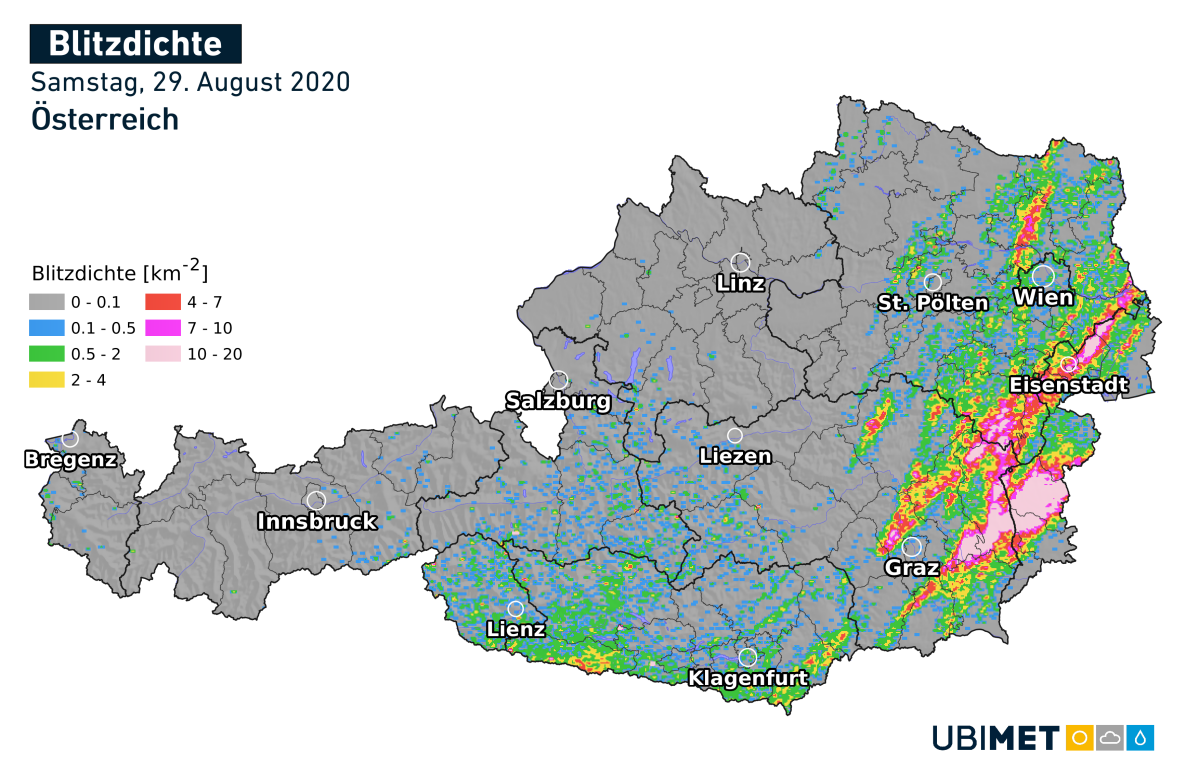 Am Samstag gab es im Südosten heftige Gewitter, landesweit wurden knapp über 60.000 Blitzentladungen erfasst. Besonders betroffen waren das Burgenland und die Steiermark mit 21.261 bzw. 19.547 Entladungen. Ein besonders kräftiges Gewitter sorgte in einem Streifen vom Großraum Wildon über Ilz bis in die Bezirke Oberwart und Güssing für teils großen Hagel und Sturmböen. Der stärkste Blitz mit einer Stromstärke von 171 kA wurde in der Gemeinde Stadtschlaining im Bezirk Oberwart gemessen.